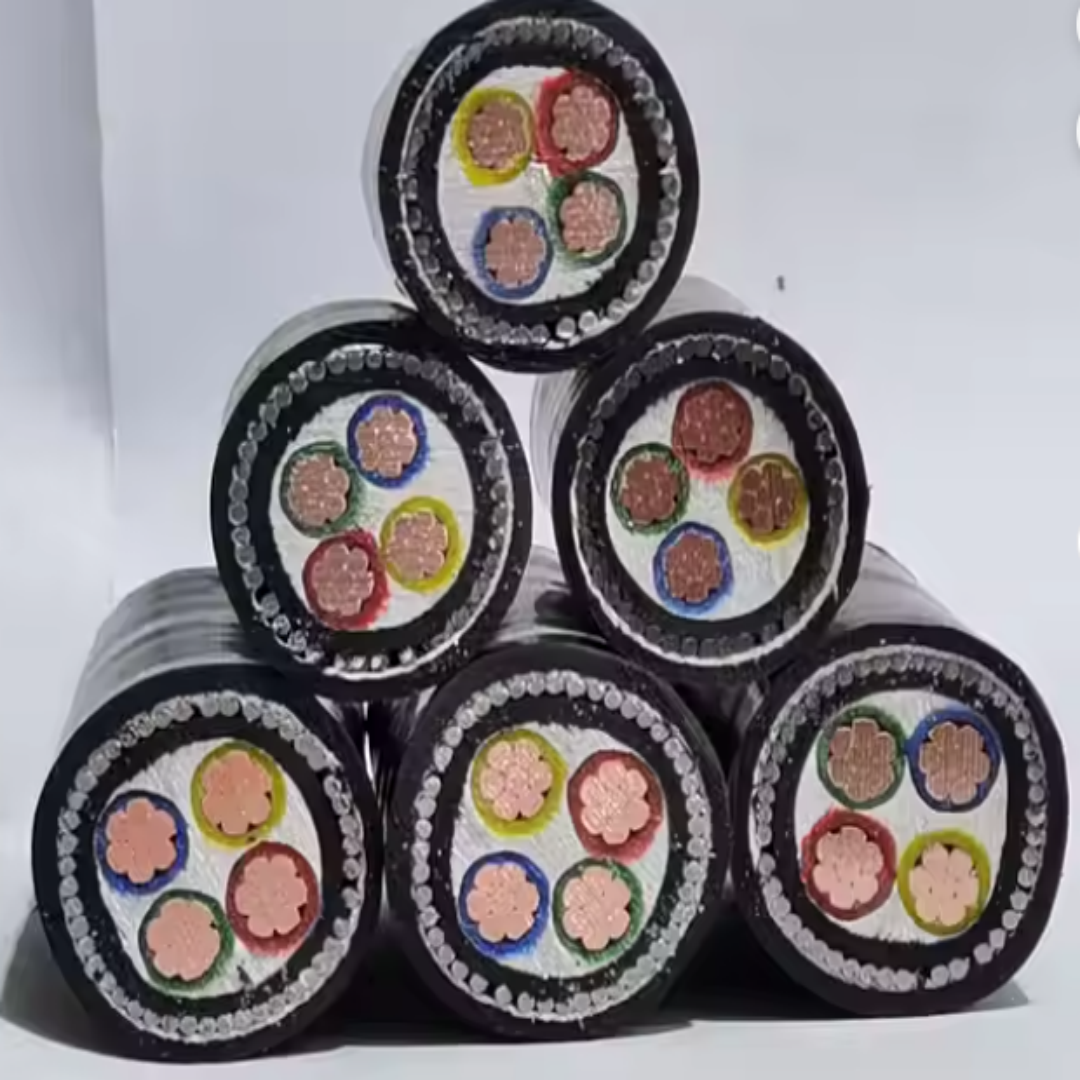 This Armoured Cable series features 4-core Pure Copper Conductor design, available in nine standard sizes from 16mm² to 185mm². Rated voltage 0.6/1kV, conductor complies with IEC 60228 Class 2. XLPE insulation thickness 1.0-2.5mm. Aluminum Tape armouring adopts double-layer gap winding structure with thickness 0.15-0.3mm. Flame-retardant PVC outer sheath thickness 1.8-3.2mm. Certified to IEC 60502, GB/T 12706 standards.